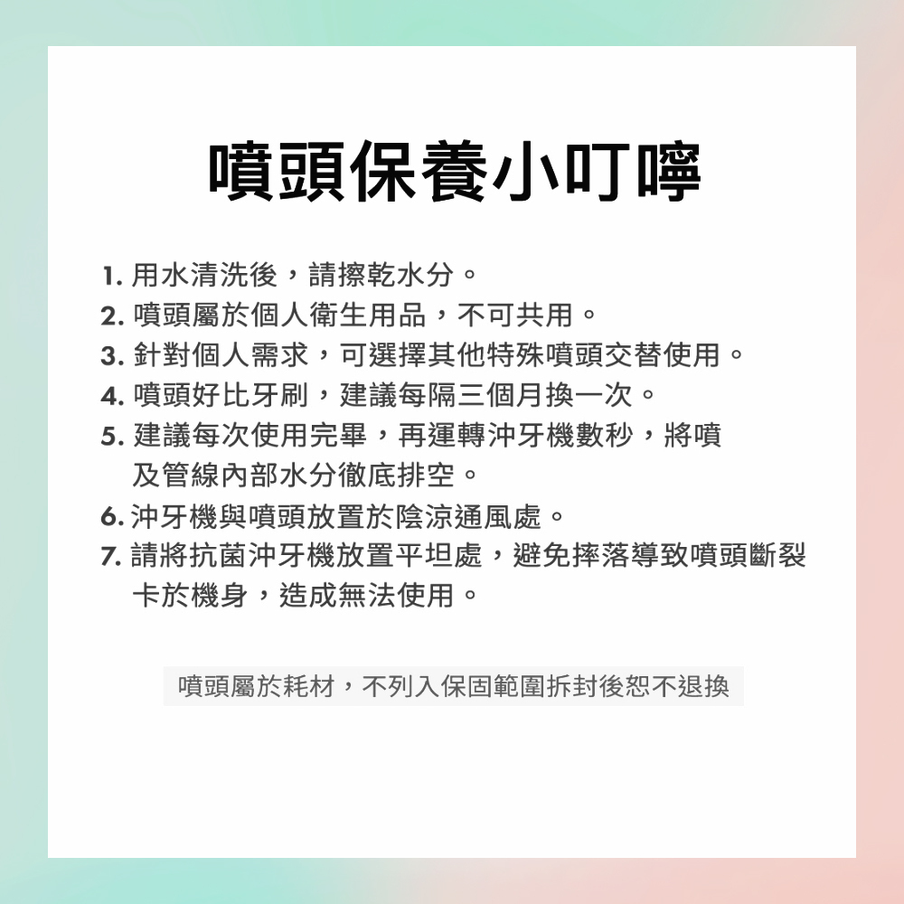 • 噴頭為沖洗舌苔用途。定時清潔減少異味